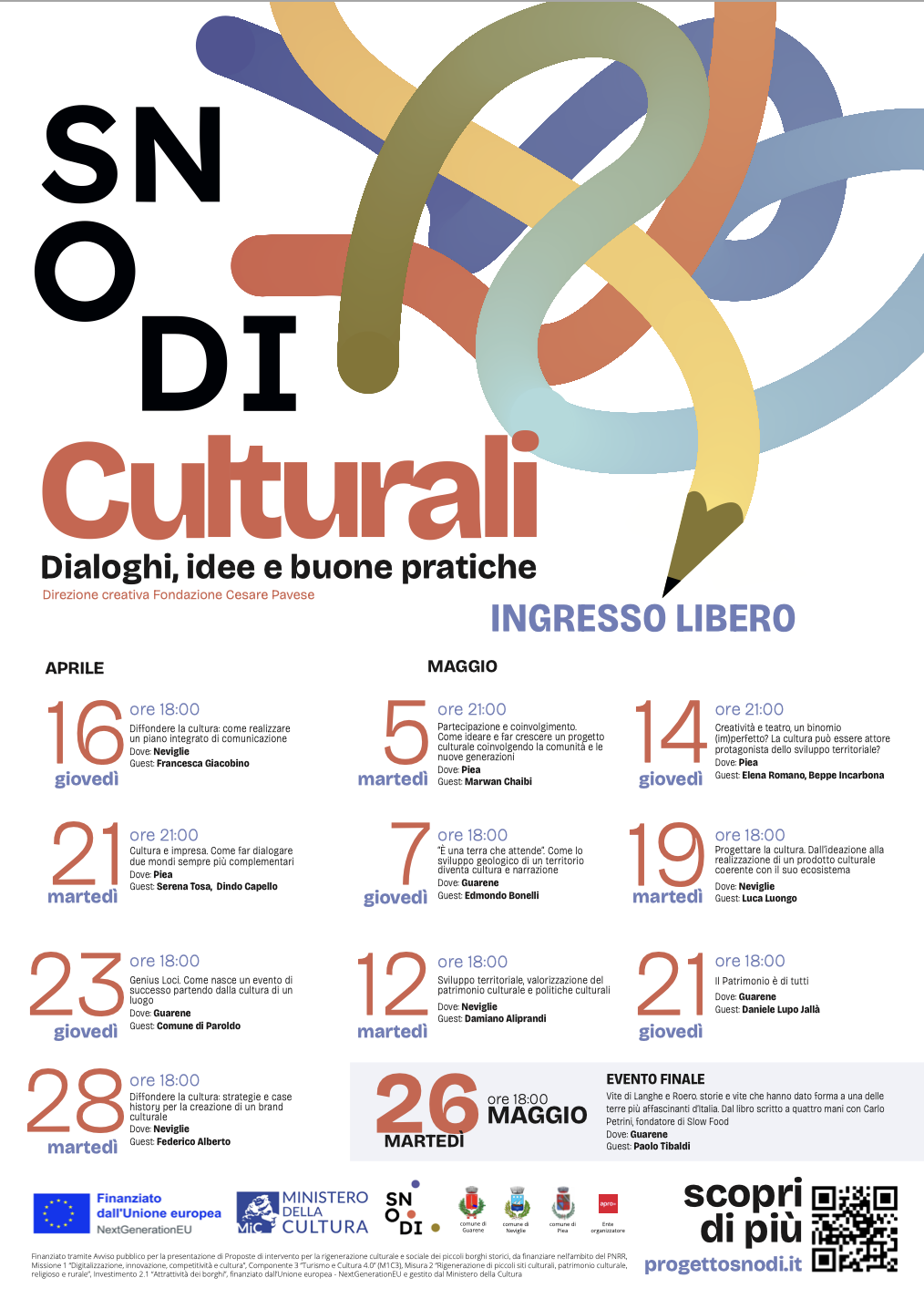 Il percorso si conclude con “Snodi culturali”, un ciclo di 11 incontri gratuiti e aperti al pubblico che si terranno tra il 16 aprile e il 26 maggio con la direzione creativa della Fondazione Cesare Pavese. Gli incontri, moderati da Pierluigi Vaccaneo, si svolgeranno il martedì e il giovedì in alcuni luoghi simbolici del progetto: a Guarene e a Piea presso gli hub riqualificati grazie a Snodi, mentre a Neviglie gli appuntamenti avranno luogo sul belvedere “The Traveler” dell’artista Jean-Marie Appriou che in questi anni ha ospitato diversi appuntamenti di Snodi oppure, in caso di maltempo, presso la Chiesa dei Battuti Bianchi.