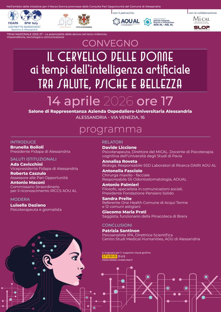 Un momento di riflessione e confronto sul rapporto tra scienza, società e ruolo delle donne nell’epoca delle nuove tecnologie. È questo il tema al centro del convegno “Il cervello delle donne ai tempi dell’intelligenza artificiale. Tra salute, psiche e bellezza”, in programma martedì 14 aprile alle ore 17 nel Salone di Rappresentanza dell’Azienda Ospedaliero – Universitaria di Alessandria.