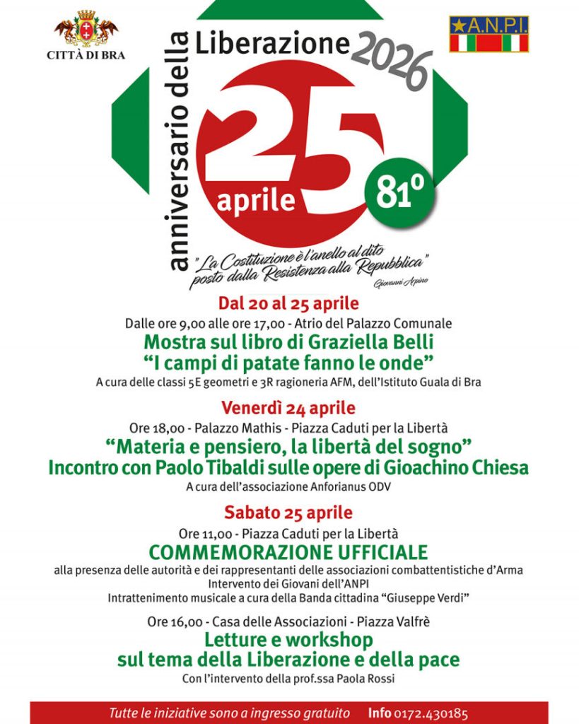 Commemorazione Ufficiale del Comune di Bra in occasione dell’81° anniversario della Liberazione, sabato 25 aprile 2026 alle ore 11, in piazza Caduti per la Libertà, alle ore 16,00 Letture e workshop sul tema della Liberazione e della pace