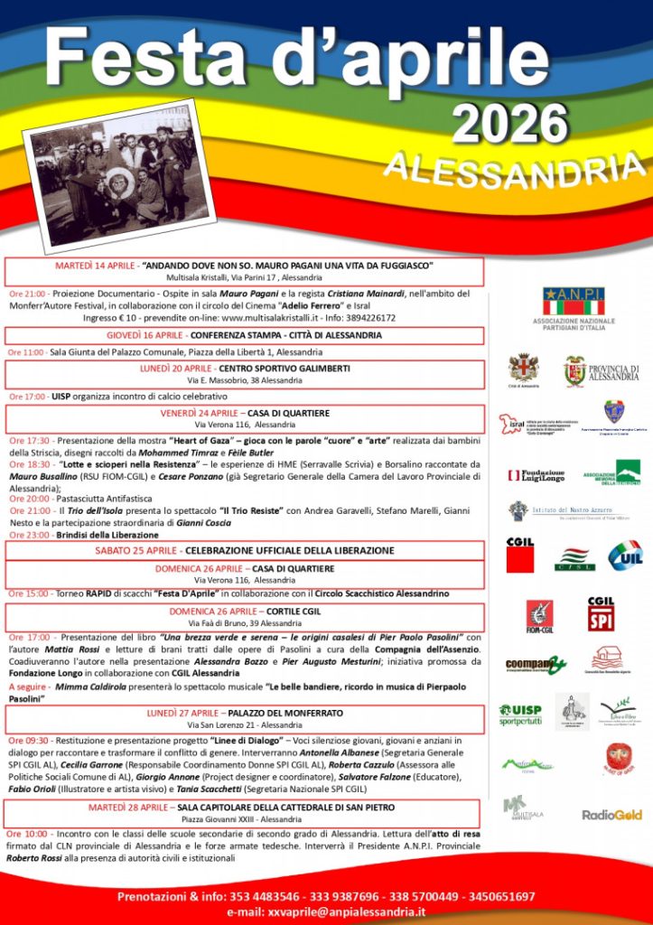 Il Presidente della Sez. Comunale A.N.P.I. Alessandria Dario Gemma, ribadisce: “’La Festa d’Aprile rappresenta, ancora una volta, un’occasione fondamentale per rinnovare i valori della libertà, della democrazia e dell’antifascismo, promuovendo una cultura di pace e coinvolgendo attivamente la cittadinanza in un percorso condiviso di memoria, responsabilità e futuro. La memoria della Resistenza non è solo ricordo, ma impegno quotidiano per la pace, i diritti e la Costituzione”.