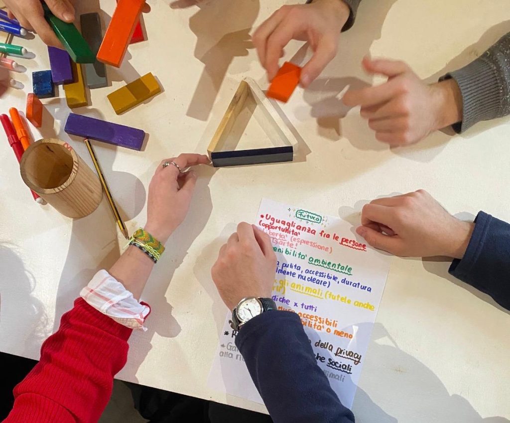 Gli studenti hanno trovato davanti a loro dieci tasselli colorati, una trottola ed una domanda. Da quest’ultima ha avuto inizio il gioco ed i ragazzi vi hanno trovato una risposta grazie ad un percorso a tappe costellato di riflessioni, colori e confronti fra i giocatori. Non si tratta di una semplice attività ludica, ma di uno strumento alternativo per analizzare e osservare i rapporti sociali in una comunità, raccogliendo dati nel contesto di uno specifico progetto, che ha attivato nelle menti degli studenti un microcosmo, presentandosi come lo specchio di una microcomunità.