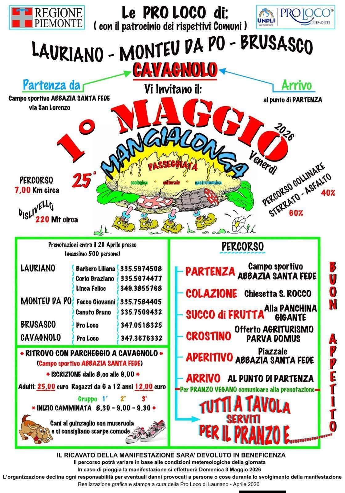 CAVAGNOLO – LAURIANO – MONTEU DA PO – BRUSASCO (TO). Venerdì 1° maggio “MANGIALONGA”