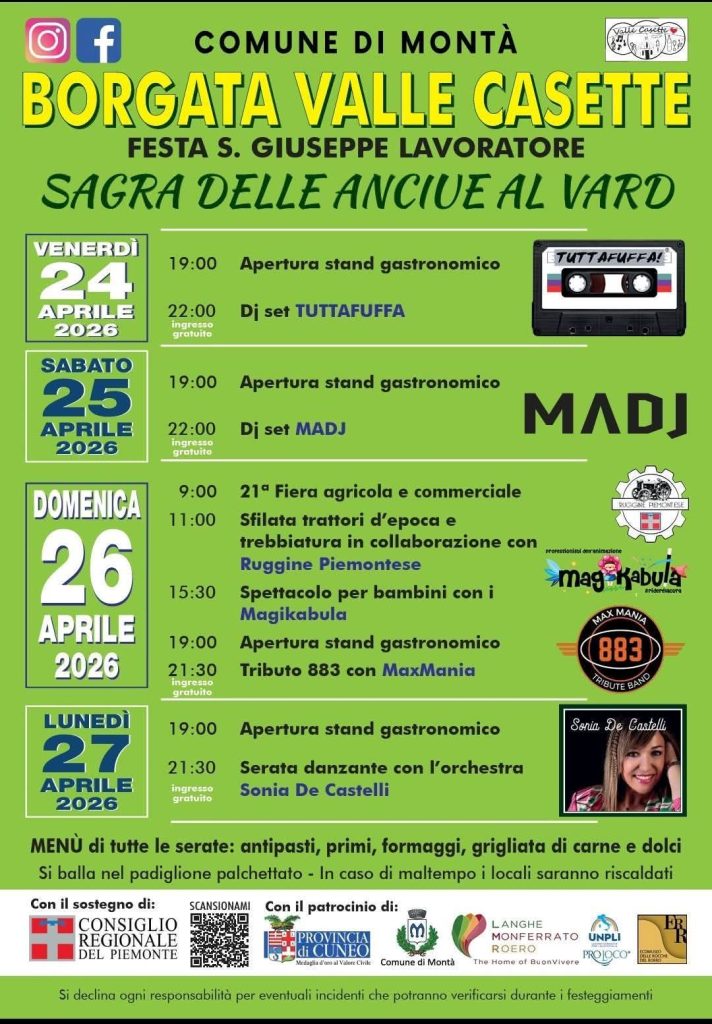 MONTA’ (CN), Da venerdì 24 a lunedì 27 “Sagra delle anciue al vard” alla borgata Valle Casette.