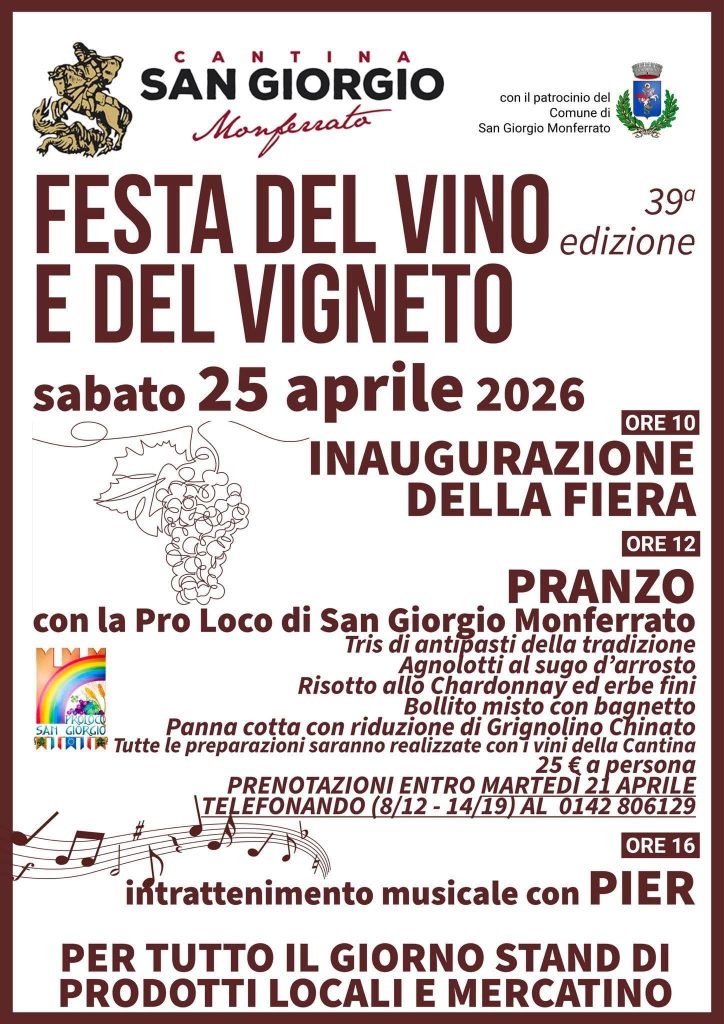 SAN GIORGIO MONFERRATO (AL). Sabato 25 aprile “FESTA DEL VINO”.