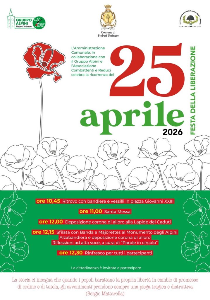 L’Amministrazione comunale di Piobesi Torinese, in collaborazione con il Gruppo Alpini e con l’Associazione Combattenti e Reduci, promuove anche quest’anno le celebrazioni per il 25 Aprile, ricorrenza simbolo della Liberazione e dei valori di libertà, democrazia e partecipazione che fondano la vita del Paese.