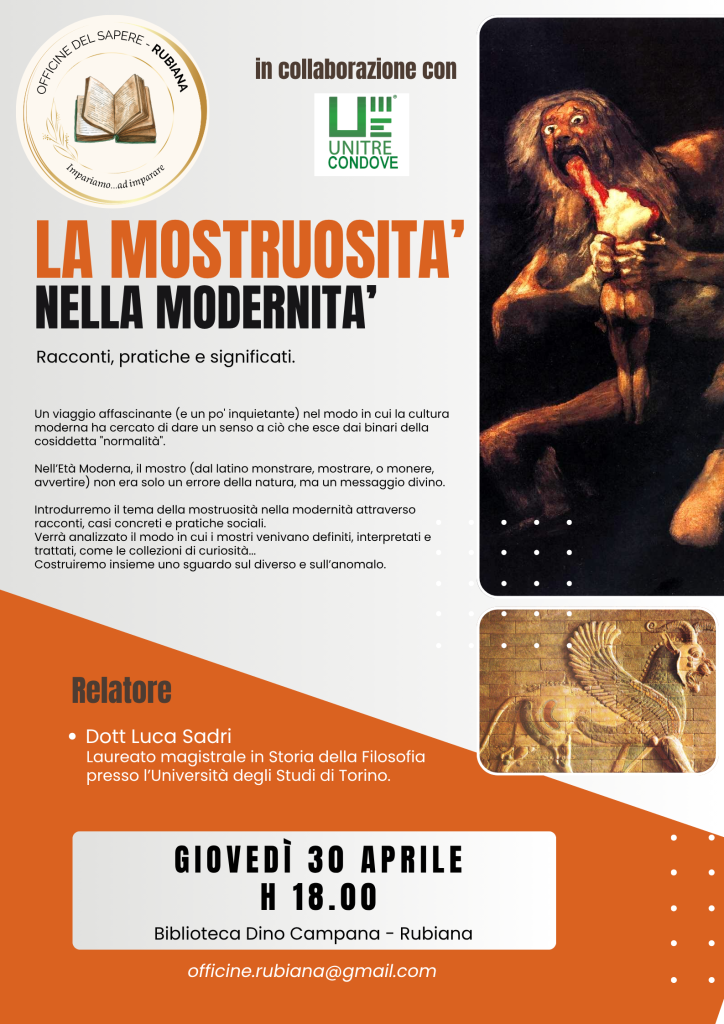 Rubiana le “OFFICINE DEL SAPERE” : LA MOSTRUOSITA’ NELLA MODERNITA’, Racconti, pratiche, significati.