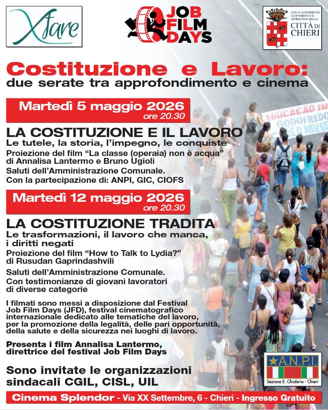 Nelle serate del 5 e del 12 maggio prossimi il Cinema Splendor di Chieri ospiterà 2 serate promosse dall’associazione XFare di Baldissero Torinese e patrocinate dalla Città di Chieri dedicate al rapporto tra la Costituzione ed il lavoro, con l’obiettivo di rimettere in primo piano il valore del lavoro partendo dalla sua definizione all’interno della Carta Costituzionale quale fondamento della repubblica. Sarà descritto ed approfondito il percorso di crescita della consapevolezza operaia fino all’approvazione dello Statuto dei Lavoratori nel 1970 proseguendo poi nella seconda serata con l’individuazione dei cambiamenti del mondo del lavoro, del lavoro precario e della mancanza di lavoro: precarizzazione, dequalificazione e mancanza di lavoro che costituiscono una sorta di tradimento delle premesse individuate nella Carta Costituzionale.