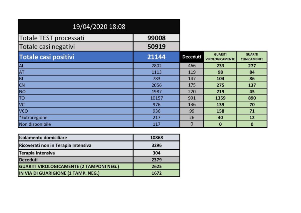 Oggi pomeriggio l’Unità di Crisi della Regione Piemonte ha comunicato che il numero di pazienti virologicamente guariti, cioè risultati negativi ai due test di verifica al termine della malattia, è di 2.625 (185 in più di ieri): 233 (+40) in provincia di Alessandria, 98 (+7) in provincia di Asti, 104 (+4) in provincia di Biella, 275 (+15) in provincia di Cuneo, 219 (+3) in provincia di Novara, 1.359 (+66) in provincia di Torino, 139 (+10) in provincia di Vercelli, 158 (+35) nel Verbano-Cusio-Ossola, 40 (+5) provenienti da altre regioni.