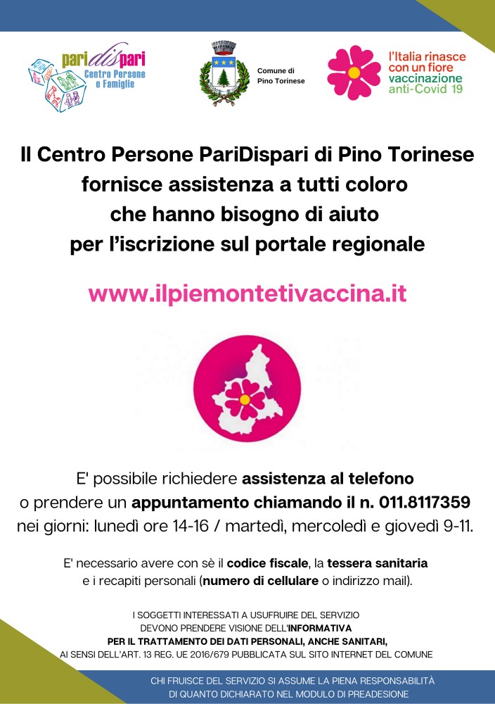 Prosegue l’attività del Comune di Pino Torinese, svolta dal Centro Persone e Famiglie PariDispari, di affiancamento e supporto a tutti coloro che, rispondendo ai necessari requisiti, possono manifestare sul sito ilpiemontetivaccina.it la propria volontà di essere vaccinati contro il Covid-19. Alla data del 28 aprile sono state processate circa 25 pratiche e data assistenza telefonica a oltre 80 soggetti. Un servizio che viene offerto, in modo gratuito, a tutti coloro che necessitano di un aiuto nella registrazione al portale e nella procedura di preadesione per la vaccinazione
