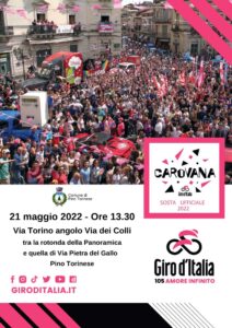 Il passaggio del tour è, come da tradizione, preceduto dalla “Carovana Rosa”, sfilata di circa 50 mezzi divertenti e scenografici, tra cui i famosi truck rosa, che attraversano tutta l’Italia anticipando la gara con spettacoli, musica, balli e gadget e coinvolgendo così la cittadinanza nella grande festa che è il Giro d’Italia. A Pino Torinese la “Carovana Rosa” sosterà alle ore 13,30 in via Torino angolo via dei Colli, tra la rotonda della Panoramica e la rotonda di via Pietra del Gallo: colore, divertimento, gioia e coinvolgimento per tutto il pubblico del ciclismo che porta festa lungo il percorso.