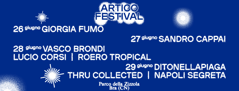 La lineup è ad ora formata da: VASCO BRONDI, DITONELLAPIAGIA, GIORGIA FUMO, SANDRO CAPPAI, LUCIO CORSI, THRU COLLECTED, NAPOLI SEGRETA, GAIA MORELLI e ELSO. Per ognuno degli artisti in programma, la data ad Artico sarà l’unica in Piemonte quest’estate.