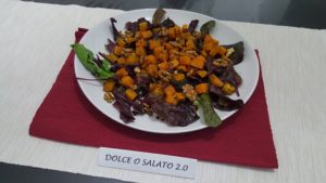 Oggi vi lascio un’insalata con la zucca. Comoda perché il lavoro più impegnativo (la pulizia e la cottura) può essere svolto tranquillamente in anticipo. All’ultimo momento ci resta solo l’assemblaggio del piatto. Piatto che io servo come antipasto ma che si trasforma in un piatto unico se aggiungiamo, a esempio, dei ceci oppure dei cubetti di formaggio. In foto insieme alla zucca ci sono le bietoline rosse ma potete variare con gli spinacini da insalata.