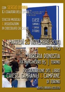 A cura di Monginevro Cultura e dell’Associazione Nazionale della Sanità Militare Italiana è stato pubblicato il volume “Chiese, Campanili & Campane di Torino”. Più che una monografia, più che un libro storico-fotografico interamente a colori, è un compendio di aneddoti, di curiosità, di immagini, di spigolature e di episodi storici, attraverso i quali un gruppo di autorevoli ricercatori, giornalisti e scrittori (Piero Abrate, Francesco Albano, Luigia Casati, Raffaello Emaldi, Achille Maria Giachino, Milo Julini, Anna Perrini) coordinato da Sergio Donna, ha ricostruito la storia della città e del suo patrimonio artistico-religioso, prendendo spunto dalle oltre cento chiese e dai loro campanili che svettano sul panorama cittadino, stagliandosi sull’incomparabile arco alpino che circonda il capoluogo sabaudo.