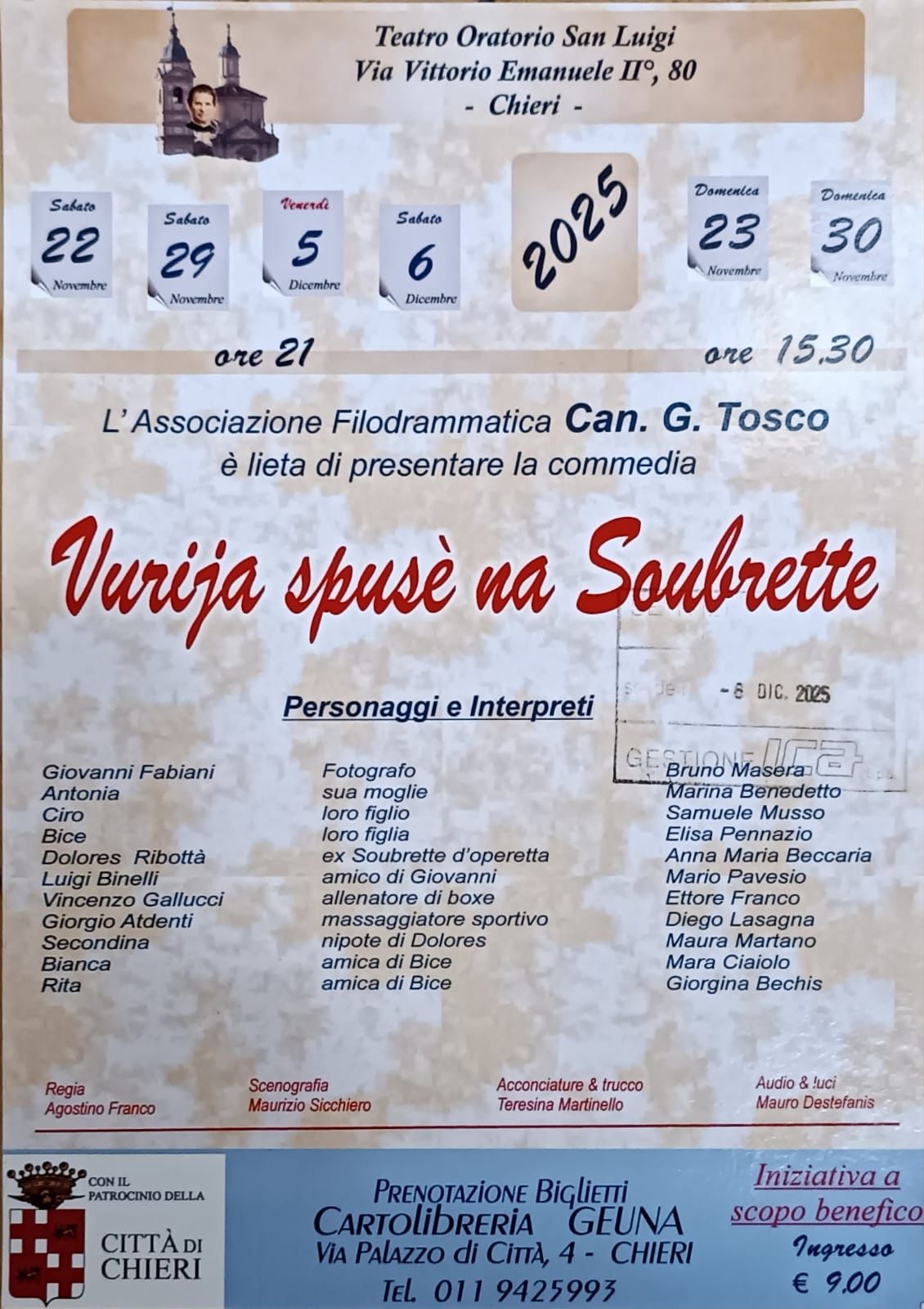 Chieri. Rider investito da un’auto in Via Vittorio. Grave all’ospedaleChieri. Consiglio comunale. Respinta la mozione-Sabena e polemiche in aula e sui socialMoncalieri. Per l’aggressione e la violenza sul 15enne disabile arrestati un 14enne e un 15enneCasellette. Cade da una impalcatura a 9 metri di altezza. Operaio morto sul colpo Chieri. Musica domestica: i Fiati di MozartCasale Monferrato. La nazionale islandese di basket al PalaEnergicaLa CittĂ di Alba ha celebrato i 170 anni del Teatro Sociale “Giorgio Busca”PINEROLO – NATALE 2025: LUCI, ARTIGIANATO E MERAVIGLIA DAL 6 DICEMBRE ALL’11 GENNAIOCasale Monferrato. Natale 2025 tra Museo e Biblioteca Casale Monferrato. Sabato 29 novembre cerimonia di accensione delle luci e delle installazioni di NataleChivasso. Cerimonia di conferimento cittadinanza onoraria ai minori nati nel ComuneLIBRI E LIB(E)RI. Gli appuntamenti alla Mondadori fino a gennaioCittĂ Metropolitana. Interruzioni per lavori sulle provinciali 8 e 46 di Pont e Druento. Riaperta la Sp 193 a GiavenoTorino. Concerto di Natale Mirabile Mysterium a favore di TricicloBra. Buone Feste a Bra: Tutte le iniziative in attesa del NataleRagazza 22enne di Torino perde la vita su un’auto tamponata dopo un incidente in autostradaChieri. Al Teatro San Luigi le repliche di “Vurija spusè na Soubrette” con la Filodrammatica ToscoA Pavarolo l’ultimo appuntamento 2025 di “Psicologia condivisa”Alessandria. Presentato il catalogo “Il Moncalvo e la sua bottega Movimento e sentimento nella Controriforma”Buttigliera d’Asti. Divieti temporanei di circolazione e sosta per lavori sulla segnaletica orizzontaleCanavese. Tamponamento a catena a Strambino. Cinque feriti, due al Cto con l’elisoccorsoDOMODOSSOLA. AGGREDISCE FAMILIARI E CARABINIERI, ARRESTATA 35ENNE OSSOLANA1234512345678 Visto da: 147.936