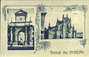 “Chieri, la medievale “città dalle cento torri”. Dimenticata dal forestiero, frettolosamente ricordata dalle guide, essa meriterebbe un più diffuso cenno. Ha origini remotissima: Plinio la menziona. Arsa nel 1155 dal Barbarossa, risorta tre anni dopo, vi sostò nel 1494 e nel 1495 Carlo VIII di Francia, alla partenza e al ritorno dall’impresa di Napoli; subì vicende complicate e tumultuose e divenne, nel 1785, principato a favore del duca d’Aosta, Vittorio Emanuele. Ricca d’arte, di storia e d’industrie, le nuoce forse la vicinanza di Torino. Rarissimi capitano i visitatori per le sue stradicciole vellutate d’erba o sostano sotto il suo splendido arco di trionfo eretto nel 1580 per onorare Emanuele Filiberto. Eppure ha templi importanti: un Duomo in perfetto stile gotico, anteriore al 1037, con sepolcri illustri, la più grande – osserva lo Stroffarello – fra le cattedrali del Piemonte; S. Domenico, con l’attiguo convento ove risiedé, dal 1427 al 1434, l’Ateneo Torinese; S. Filippo del Juvarra; S. Giorgio, sul poggio omonimo da cui si scorgono, nella cornice dei fitti vigneti, i superstiti castelli della Rocchetta e della Mina; S. Antonio; S. Bernardino… Ovunque, in codeste chiese, sono tele di sommi pittori e nelle vie, anche nelle case più meschine, non un muro dal quale non escano preziose vestigia architettoniche. Oggi, la città si sviluppa nelle industrie e nei commerci con più di trenta grandi stabilimenti e con la caratteristica fabbricazione “a domicilio” delle coperte, per cui un gigantesco telaio troneggia in molte abitazioni, occupandone spesso l’unica stanza dal pavimento al soffitto. Con tutto ciò essa conserva la sua vecchia fisionomia tra il campereccio e l’austero. Donne sulle porte, sedute davanti agli arcolai. Qua e là, angoli sepolti in un grigiore claustrale. Lunghi e alti muri rossicci in fondo ai quali scantona il saio di un domenicano o biancheggia l’alone di una suora. Siamo a dieci chilometri da Torino e par d’esserne lontanissimi. Chieri, più che pel suo patrimonio artistico e storico, è nota per lo scintillante freisa e per le sue ortaglie. Nominate Chieri e non vi diranno “la città dalle cento torri, patria dei Balbo e dei Benso, tomba del Cottolengo”, ma, semplicemente, “la città del cardo”, del quale, imbevuto in un succo bollente, i piemontesi sono ghiottissimi.”