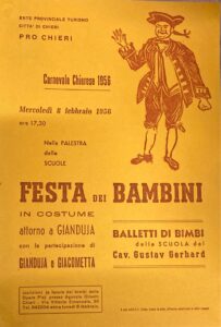Correva l’anno 1956 e per l’8 febbraio le istituzioni (Ente provinciale del turismo, Citta di Chieri, Pro Chieri) – organizzano per le ore 17,30 nella palestra delle scuole (piazza Pellico n.d.r.) una «festa dei bambini in costume attorno a Gianduja e Giacometta con balletti della scuola del cav. Gustav Gerhard». Punto di riferimento per informazioni, preiscrizioni e iscrizioni l’agenzia Olivetti in via Vittorio Emanuele 36 sino al 6 febbraio. A seguire la manifestazione con tanti ragazzini accompagnati da genitori, nonni, cugini, amici.