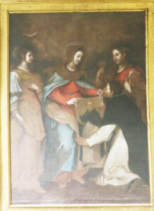 Morgari raffigurante San Domenico che dagli Apostoli Pietro e Paolo riceve il libro dei Vangeli e il bastone del pellegrino, gli emblemi della sua missione. Anche questo quadro raffigura San Domenico, ma in un altro contesto: quello di una apparizione che ebbe per protagonista un frate domenicano, fra Lorenzo da Grotteria, e per teatro la località di Soriano Calabro, presso Vibo Valentia, e il suo grande convento domenicano. Si racconta che nel 1530 la Vergine Maria, insieme alle Sante Caterina d’Alessandria e Santa Maria Maddalena, sia apparsa al frate e gli abbia affidato un’immagine di San Domenico da consegnare al Priore del convento perché la esponesse alla venerazione dei fedeli. Il quadro raffigura quella scena: la Vergine che al centro, fiancheggiata dalle due Sante, consegna l’immagine di San Domenico al frate, caduto in ginocchio davanti a lei. Si tratta di un’opera settecentesca di autore ignoto. Ad aver bisogno di restauro non è soltanto la tela, offuscata da oltre due secoli di esposizione alle polveri e al fumo delle candele, ma anche la bella cornice dorata.