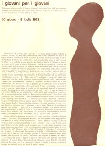 A partire dal 1972 però si prova a voltar pagina pur se con risultanti a dir poco contrastanti. Per volere di chi in quel momento governa la città (Egidio Olia e Giovanni Salerno in particolare) e sotto l’organizzazione del Teatro Stabile (Rolando Picchioni) e della Provincia di Torino si inizia ad ospitare la rassegna internazionale di teatro sperimentale I Giovani per i Giovani nel tentativo di “sprovincializzarsi” e di scrollarsi di dosso almeno parte delle antiche e didascaliche rappresentazioni messe in scena con orgoglio e grandissima buona volontà – ne va dato atto – sui polverosi palchi di San Luigi, della Congregazione Mariana, di Sant’Anna, di Santa Teresa e del Duomo. (Quanta abbondanza di spazi se confrontata alla penuria di oggi!).