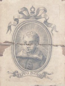Si tratta di una piccola immagine che rappresenta un bambino a mezzo busto con il suo soprannome scritto su un cartiglio e associato a un aggettivo: PIPPO BUONO. Filippo da bambino veniva chiamato così, si legge infatti in una sua biografia del 1745: Rendevasi amabile, e caro a ciascheduno: sì che, e per la bontà della sua natura, e per la purità de’ suoi costumi, era da’ compagni, e dagli altri, che lo conoscevano, chiamato Pippo buono. E i romani di lui, ormai adulto, raccontavano: Era tanto umano tanto de bbon core che a Roma chi l’incontrava diceva: Ecco Pippo Bbono… Questa immagine è giunta sino a noi nonostante le traversie che i Padri dell’Oratorio vissero a Chieri; giunsero a Chieri nel 1654, subirono la soppressione napoleonica nel 1802, tornarono nel 1816 e lasciarono Chieri dopo soli quattro anni nel 1820. Non ebbero vita facile soprattutto dai confratelli degli altri Ordini religiosi, ma furono benvoluti dal popolo. Oggi San Filippo Neri è un Santo dimenticato dai chieresi (così come i padri che qui vissero): non ricordiamo di averlo compatrono, non abbiamo ricordato nel 2015 i 500 anni dalla sua nascita e quest’anno i 400 anni dalla sua canonizzazione. Nonostante tutto quel grande cuore continua a vigilare sui tetti di Chieri e su chi ci abita sotto. Anche un grande cuore può essere spunto per raccontare la nostra storia.