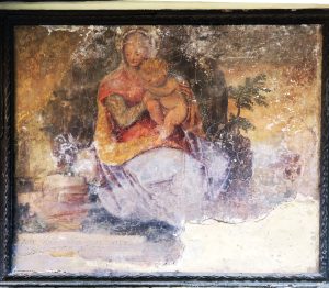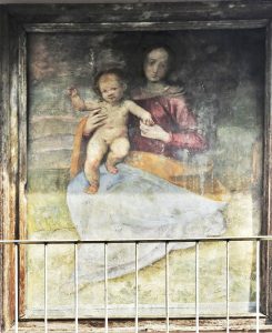 L’altro dipinto (di nuovo una Madonna col Bambino), che nell’esecuzione appare ancora più fine e “moncalvesco”, si trova in via Tana 22, in corrispondenza di un terrazzo del primo piano. Anche questo versa in condizioni precarie. Anche qui l’immagine è sbiadita, i nomi dei committenti quasi illeggibili e appena visibile è la data di esecuzione, il 1605.