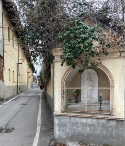 A chiudere la via – ancora presenti – il pilone votivo dedicato alla Madonna mentre, dall’altro lato, lungo tutto il suo percorso, l’imponente complesso della Tintoria Caselli si ergeva a simbolo della plurisecolare vocazione tessile della città.