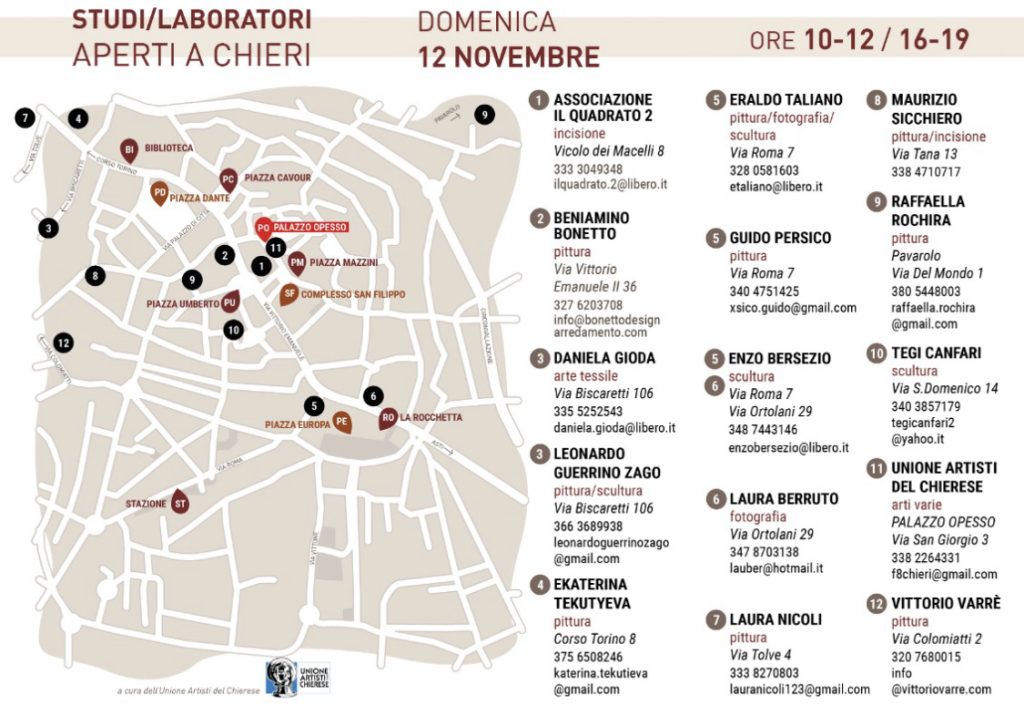 Domenica 12 novembre dalle ore 10.00 alle 12.00 e dalle 16.00 alle 19.00, l’associazione Unione Artisti del Chierese organizza con il patrocinio del Comune di Chieri “Dove si crea l’arte”. Si tratta di una manifestazione rivolta a cittadini e appassionati finalizzata a far conoscere gli artisti di Chieri all’interno dei propri studi e laboratori. L’iniziativa ha lo scopo di permettere al pubblico di ottenere un’idea più chiara del processo creativo, dell’ambiente in cui l’artista lavora e di come si sviluppano le opere, dagli stimoli visivi alla stesura del colore sulla tela.