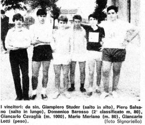Anno 1971. L’attività sportiva di atletica leggera iniziò con i Giochi della Gioventù, svolti come l’anno precedente nella piazza Dante ancora sterrata e riservati ai nati dal 1956. Ancora ottimi risultati. Maschi:  primi classificati, Antonio Orofino negli 80 mt. piani, Claudio Stocco nei 2.000, Domenico Fasano nel salto in lungo, Ernestino Luison nell’alto, Giorgio Gaetani nel getto del peso, Vittone-Oddenino-Cravero-Doni nella staffetta 4×100. Femmine: Rossana Masera nei 60 mt., Alessandra Casasanta nei 1.000, Renza Gilli nel lungo, Laura Corio nel getto del peso, Lilly Pertile nell’alto, Laura Corio nel getto del peso, Torta-Tamagnone-Gilli-Masera nella staffetta 4×100.                                                                                Nelle prove preliminari dei campionati studenteschi, Mario Meriano vince i 100 mt. con il suo nuovo limite personale di 11”4 e Jean Pierre Studer, pur dolorante ad un piede,  vince facilmente con 1,70, anche se il suo limite personale in allenamento aveva raggiunto mt. 1,91. Nelle finali studentesche svoltesi  allo stadio Ruffini, Jean Pierre Studer primeggiò in una entusiasmante gara con mt. 1,88 e Paolo Marasso si piazzò settimo con mt. 1,75, suo limite personale. Nella finale nazionale degli studenteschi svoltasi a Brescia, Studer sfiorò la vittoria con mt. 1,90, ma fu battuto da un atleta di Padova, salito a 1,93. Giovedì 10 e sabato 19 giugno, al campo FIAT,  si svolsero le due prove del campionato provinciale CSI. Altre vittorie; alcune consuete, come Meriano nei 100 mt., Gay nel lungo, Marasso nell’alto (1,78), Baiotti nel peso; Annamaria Tamagnone nei 60, Alessandra Casasanta prima in entrambe le prove negli 800 mt.; altre di esordienti: Marisa Marcante negli 80 mt. ed Anna Fasolo nel lungo. Belle vittorie anche di Dario Corvetto, classe 1958, nei 1.000, Marco Ciaiolo nell’alto, ragazzi e Piergiuseppe Merlo nel lungo. Tra i giovanissimi vittorie di Franco Pilati negli 80, Lilly Pertile nell’alto e Iside Biasiolo nel lungo.