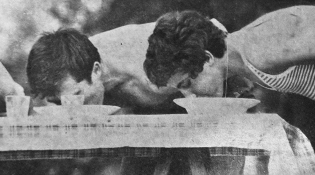 Ma torniamo a quei giorni, torniamo a quelle gare alle bocce ruotanti attorno alla Coppa città di Chieri capace di richiamare centinaia di giocatori pronti a disputare anche la gara mandamentale del lunedì; una gara in grado di attirare «grandi campioni da Torino e da altre città del Piemonte». Si trattava davvero di un importante evento capace di tener desti centinaia di appassionati spettatori sino a notte inoltrata quando, attorno alle prime ore del mattino del martedì, scattava il momento di designare i finalisti, la successiva partita e la ‘spartizione dell’oro’ (inteso come medaglie). Le gare si svolgevano non solo in piazza Dante – allora ancora da asfaltare e dove gli organizzatori tracciavano, già qualche giorno prima, i rettangoli di gioco – ma anche, vista l’enorme affluenza di giocatori, sul ‘rettangolo’ in terra battuta dell’oratorio di San Luigi trasformato per l’occasione in uno spartano bocciodromo. (vedi foto). Mentre tutto ciò accadeva in altra parte della città, al Murè – per molto tempo borgo proletario dove la concentrazione di minuscoli insediamenti tessili era davvero alta e dove ‘far festa’ diventava l’antidoto ad una difficile vita di tutti i giorni  – la ricorrenza portava il quartiere ad organizzare festeggiamenti popolari all’insegna del buon umore. Basta scorrere i settimanali locali Corriere di Chieri, ma soprattutto Il Chierese, per ritrovare una dettagliata cronaca del «ricco programma di divertimenti» proposto ai residenti in via Marconi, via Garibaldi, strada Andezeno e via Nostra Signora della Scala dove all’interno della Cappella di Scalero venivano e vengono tuttora celebrate le funzioni religiose in onore della Madonna delle Grazie. Momenti di divertimento – in parte affidati alle giostre, al ballo a palchetto, all’elezione della Miss (l’ultima di cui si abbia conoscenza verrà proclamata nel 1975) – si intervallavano ad altri di sapore decisamente popolare. come la rottura delle pignatte e l’albero della cuccagna. O come «la gara della pastasciutta» (vedi foto) che consisteva nel mangiare, sarebbe meglio dire divorare – con le mani legate dietro la schiena e nel più breve tempo possibile – tre etti di spaghetti al sugo di pomodoro; o quella, ben più cruenta del taglio della testa al tacchino: tajé la testa al pito. (vedi foto). Un’usanza non solo chierese davvero antica e propiziatoria, ormai proibita da tempo, che affondava le radici in un passato davvero remoto. Un rito che da noi veniva praticato soprattutto in inverno quando – nei freddi giorni che precedevano il Carnevale, approfittando delle allora copiose nevicate e delle successive gelate notturne – si preparava ‘la lesa’ tra via della Pace e via Albussano sin nei presso di corso Matteotti. Un percorso lungo il quale si usava scivolare usando rudimentali slitte dette lesèt. Il pito (precedentemente ucciso in modo non cruento) veniva appeso in un tratto della via dove si era certi che il lesèt prendesse da solo una discreta velocità. A quel punto per chi ci stava sopra, armato di un lungo bastone, diventava davvero difficoltoso coordinare la mira per staccare dal collo la testa del tacchino senza essere sbalzato dalla slitta. Ciò provocava grandi risate ad un pubblico intirizzito dal freddo ma pronto a combatterlo con un bicchiere di vino – magari caldo – da sorseggiare nella vicina piola che di nome faceva La Colomba, ancor meglio conosciuta come Madalin . Ma questa è un’altra storia.