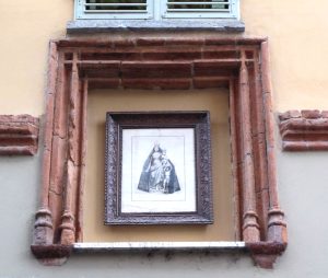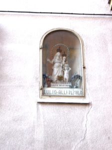 Un’antica cornice di una finestra quattrocentesca inquadra una stampa della Madonna delle Grazie datata 3 settembre 1905, anno dell’Incoronazione della statua del Duomo. Forse l’immagine fu collocata in quella circostanza.