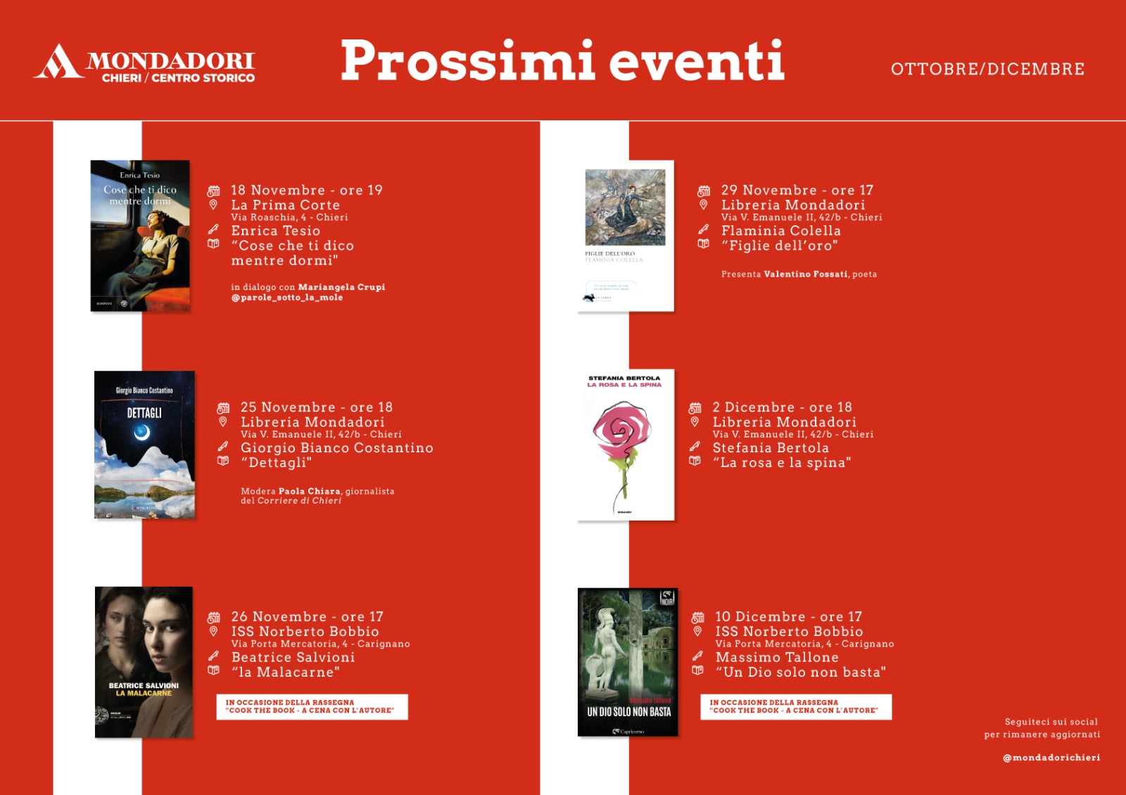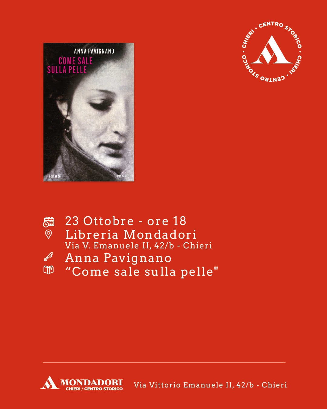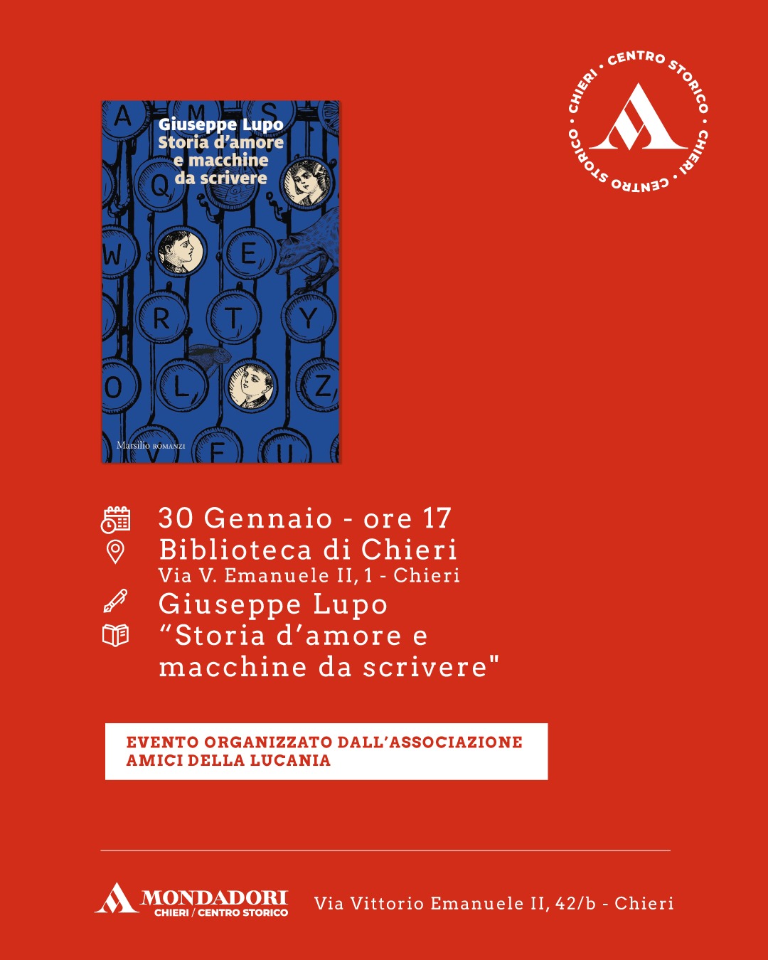 Chieri. Gli appuntamenti di marzo-aprile alla Libreria Mondadori Centro Storico Redazione 4 Marzo 2026LIBRI & LIB(E)RI. Gli appuntamenti della settimana Redazione 7 Febbraio 2026LIBRI & LIB(E)RI. “Aperitivo con l’ansia” di Francesco Cuniberti alla Libreria Mondadori Centro Storico Redazione 2 Febbraio 2026Chieri. In Biblioteca il 13 febbraio Pietro Senaldi presenta il suo libro “Sveglia!” Redazione 30 Gennaio 2026LIBRI & LIB(E)RI. Alla Biblioteca Civica di Chieri “Storia d’amore e macchine da scrivere” di Giuseppe Lupo a cura della Libreria Mondadori Centro Storico Redazione 26 Gennaio 2026LIBRI & LIB(E)RI – “La prima guerra civile” di Gianni Oliva alla Libreria Mondadori Centro Storico Redazione 26 Gennaio 2026LIBRI & LIB(E)RI – “La volta giusta” di Lorenza Gentile a “La Prima Corte” Redazione 26 Gennaio 2026LIBRI & LIB(E)RI. I prossimi appuntamenti alla Libreria Mondadori Chieri/Centro Storico Redazione 9 Dicembre 2025LIBRI E LIB(E)RI. “Figlie dell’orso” di Flaminia Colella alla Mondadori Redazione 27 Novembre 2025LIBRI E LIB(E)RI. Gli appuntamenti alla Mondadori fino a gennaio Redazione 25 Novembre 2025Chieri. Prossimi eventi alla Libreria Mondadori Centro Storico Redazione 24 Ottobre 2025LIBRI & LIB(E)RI. ANNA PAVIGNANO ALLA LIBRERIA MONDADORI CENTRO STORICO Redazione 21 Ottobre 20251212 Visto da: 11